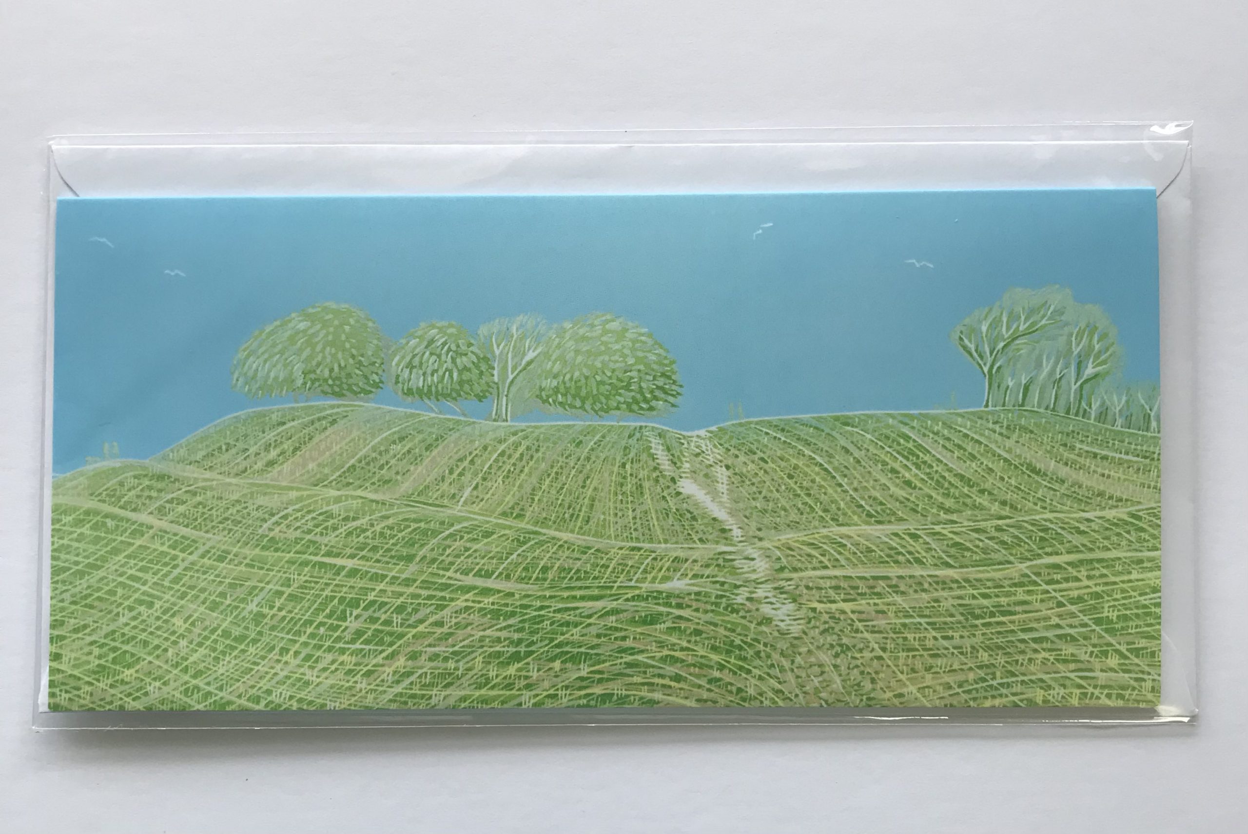 This greetings card is a professionally printed reproduction of part of my original limited edition linocut ‘Highdown’. The main picture shows the complete image but this is cropped to fit on to a card.
